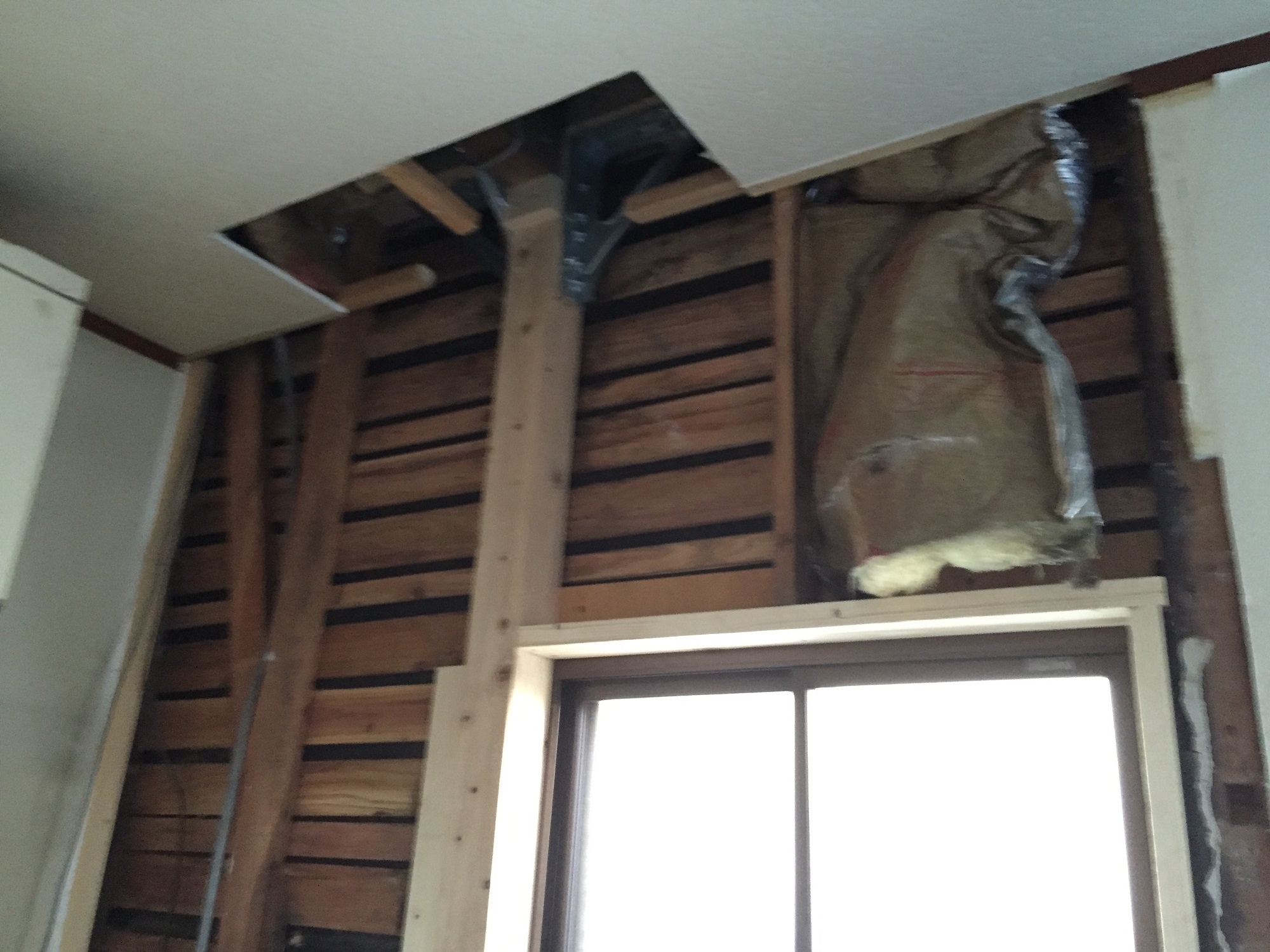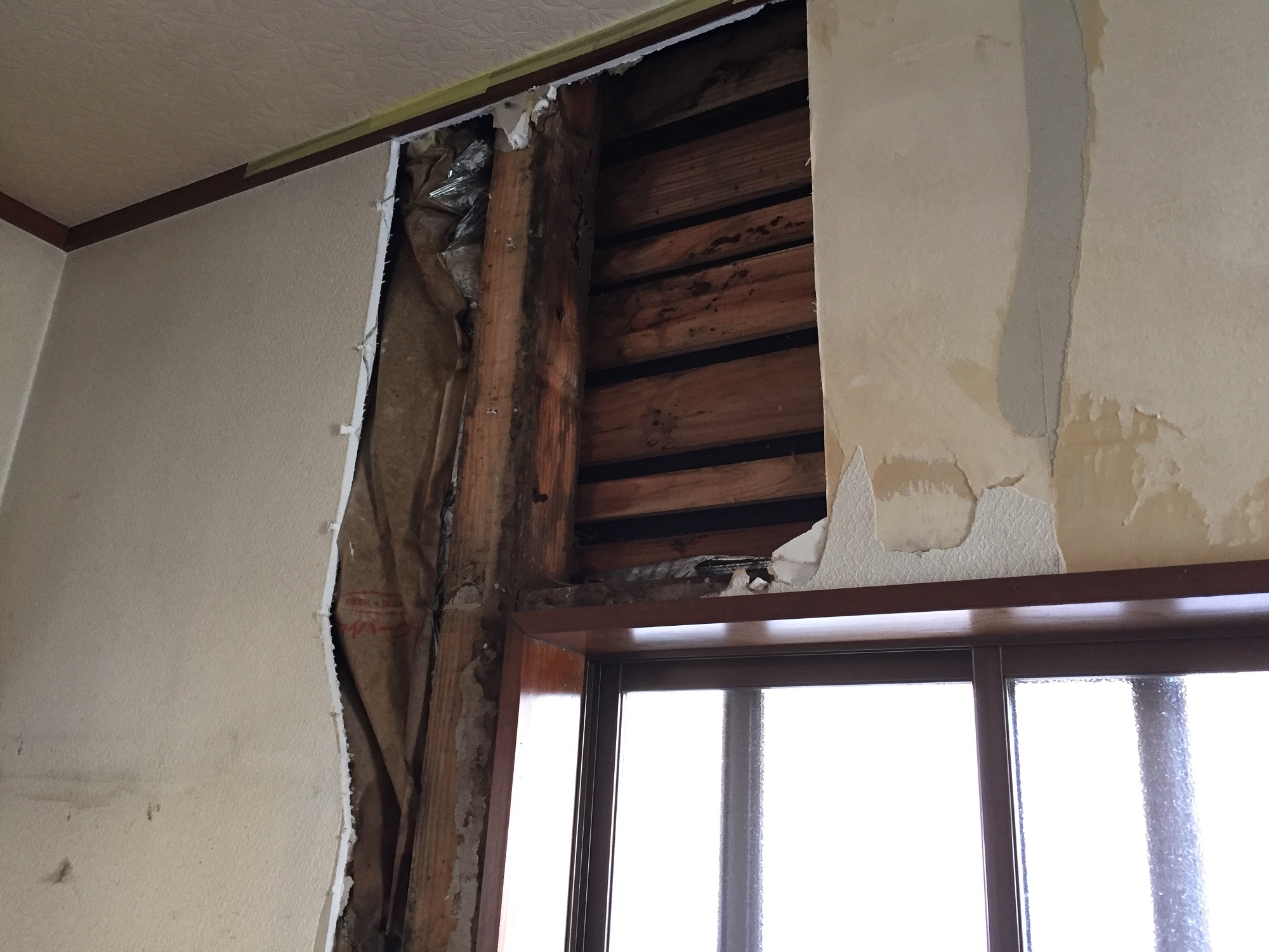 今回の雨漏りは、排水管と外壁の隙間からの雨漏りだったのですが、雨漏りヵ所のシーリングを打ち雨漏りを止め、室内の腐食したボードを張り替えようとボードを剥がすと・・・