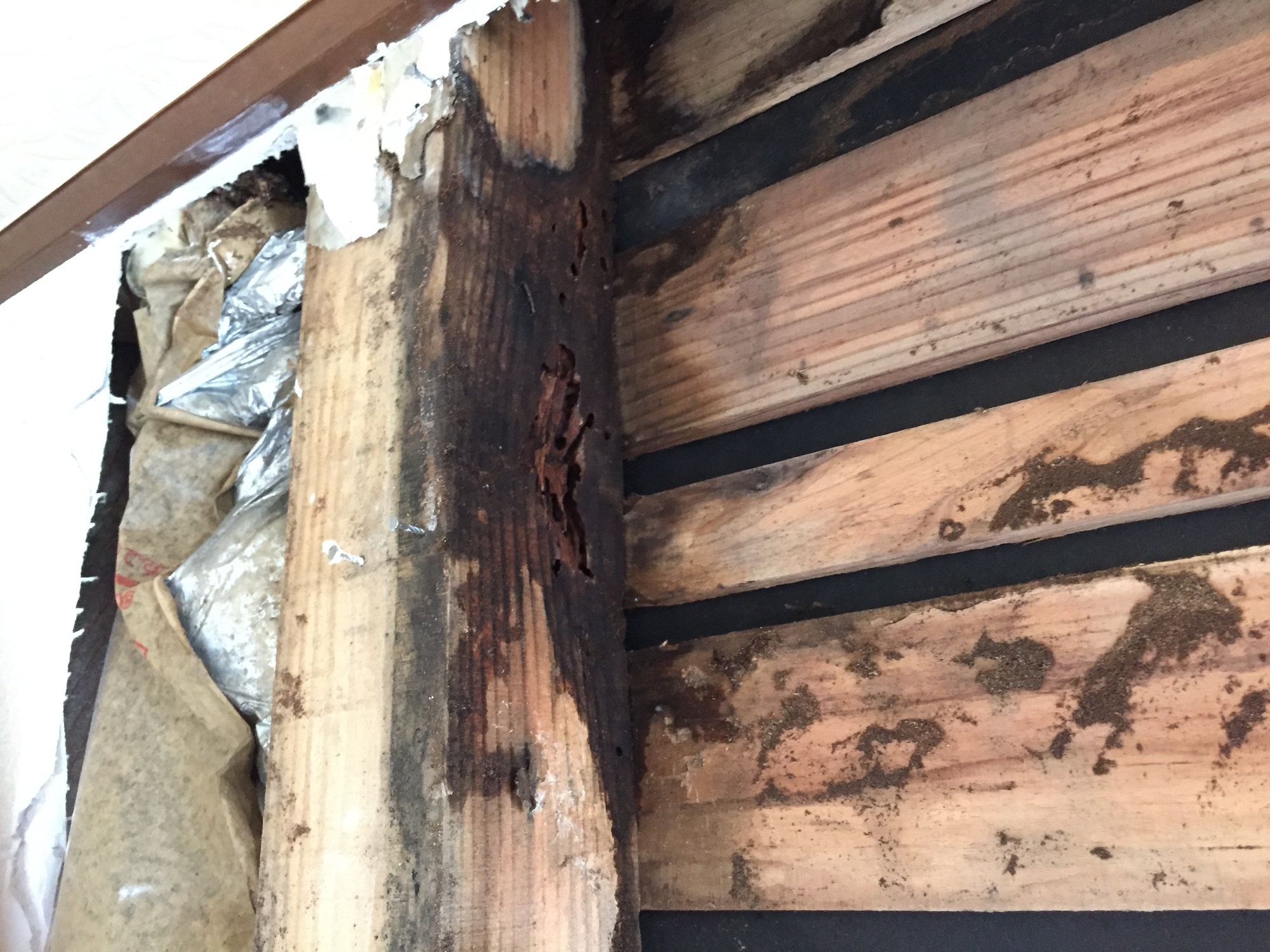 木造モルタル外壁サッシ廻りからの雨漏りでシロアリ被害、補修工事(沼津市・M様邸)