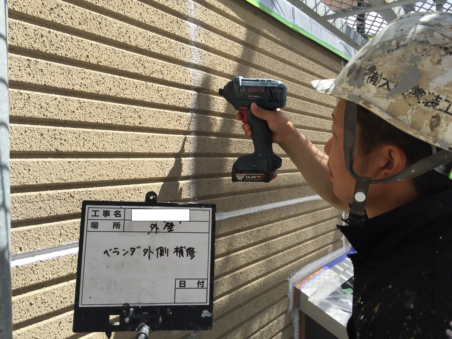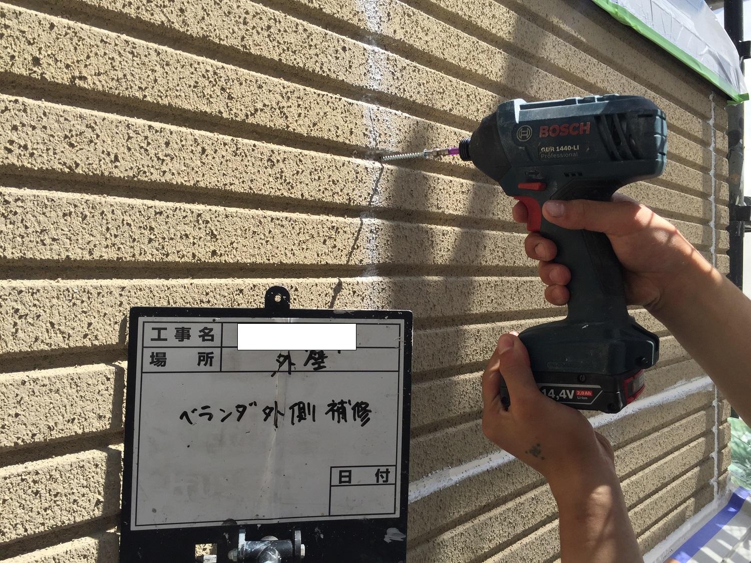 外壁の補修を行いました三島市M様邸は、外壁がALCボード(パワーボード)という外壁材で、クラック(ヒビ)などが数カ所あり、ボードの浮きも見受けられましたので、先ずはその浮きを直して行きます。
