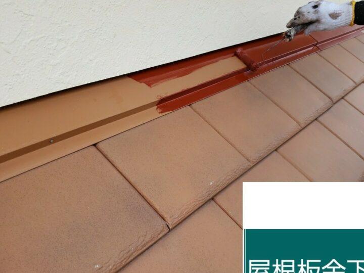 雨押えや棟は板金製です。下地処理にはケレン(ヤスリがけ)を施工します。