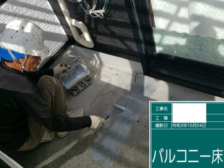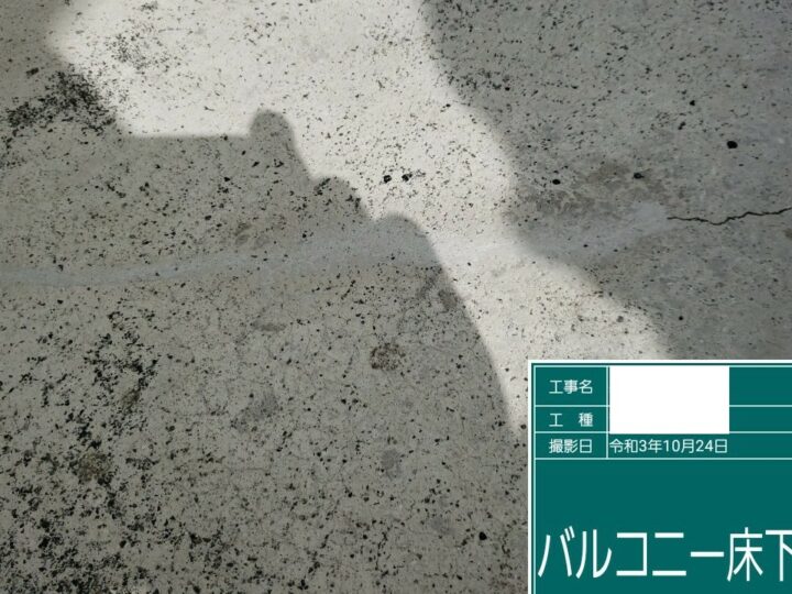 バルコニーの床はモルタルで保護されています。今後の漏れ防止の為、今回は施工範囲としました。クラックはシーリング処理いたします。