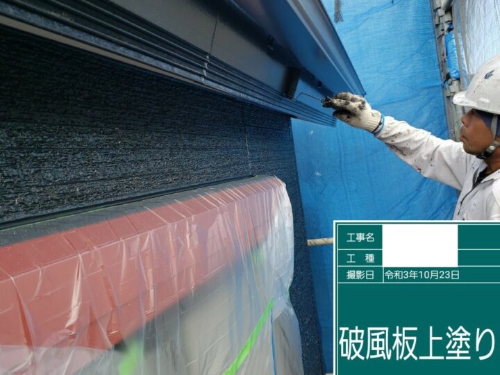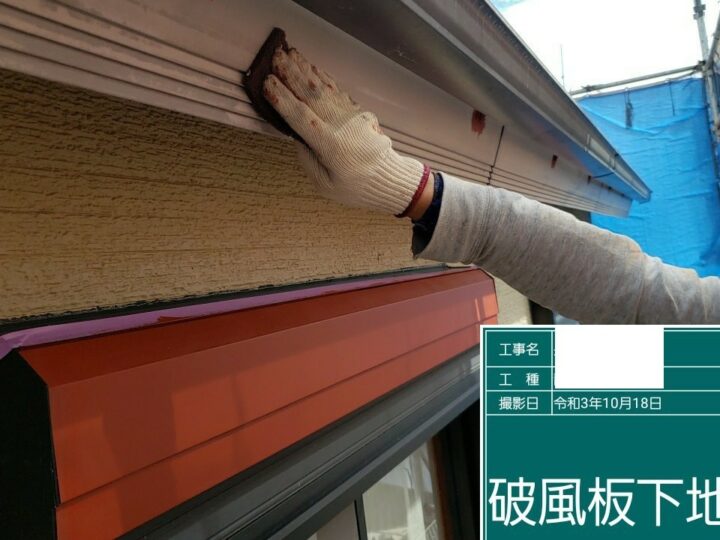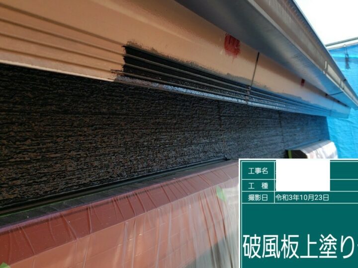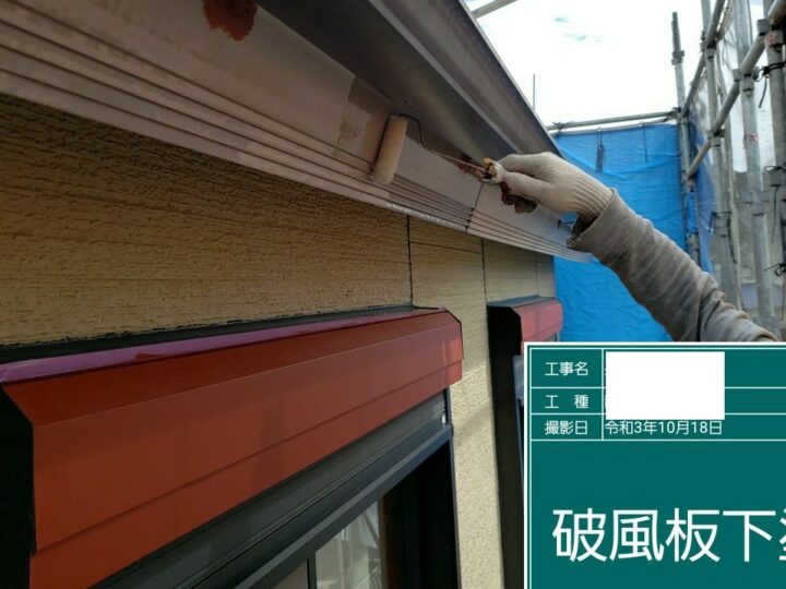 破風板もサイディング製です。外壁同様に下塗りにはカチオンシラーを塗布します。祭日に応じて、カチオンシーラーや、錆止めなど使用材料を使い分けます。
