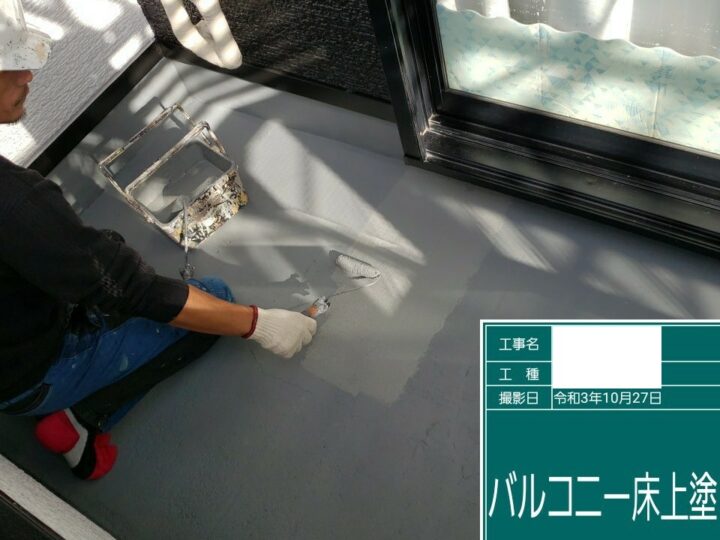床にも下塗りを塗布します。上塗りの密着性を高めます。