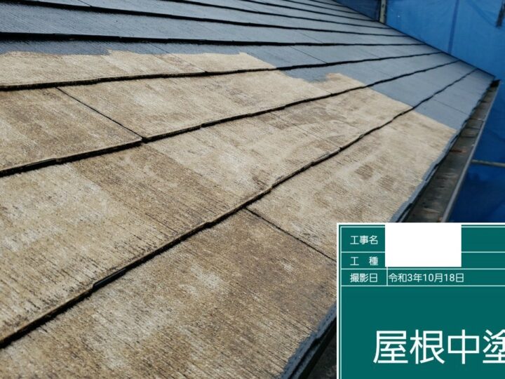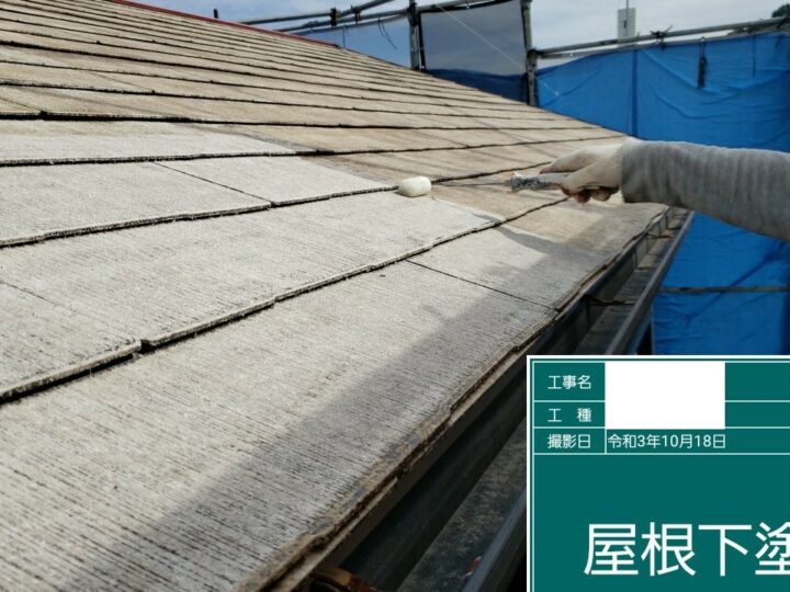 屋根の下塗りです。劣化が顕著な場合は、屋根材が下塗り材をどんどん吸い込んでしまいます。吸い込みを止めるようにたっぷりと浸透させます。