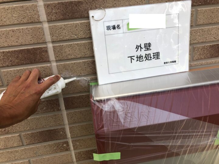 高圧洗浄後、塗装後の美観や、雨水の侵入を防ぐため、クラック補修を行いました。