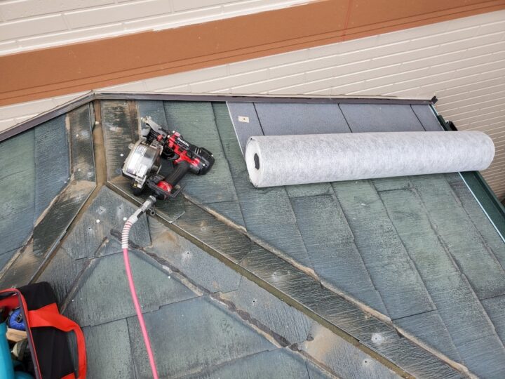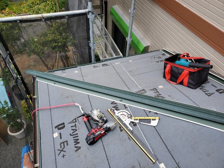ルーフィングを全面に設置した後、隅棟を先に設置しました。