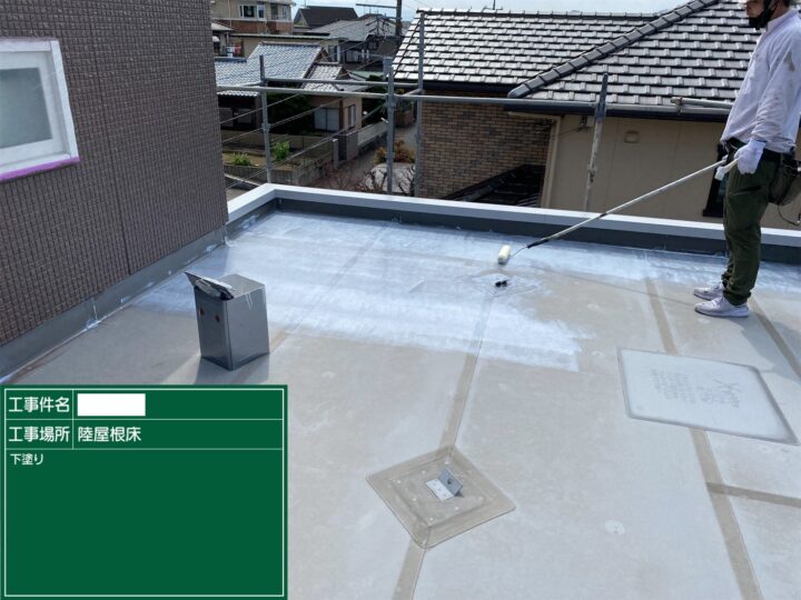 下塗りをしっかりと行うことで、雨ざらしにされる陸屋根のシートの劣化防止や、汚れ防止などにも役立ちます。ひいては、質の高い塗装を行うことができるようになるように、丁寧に塗装を行いました。