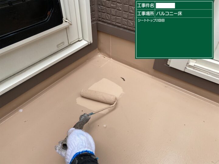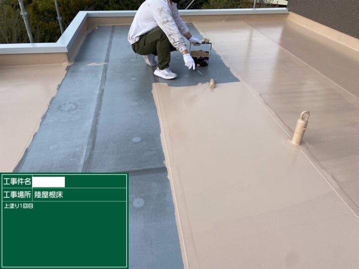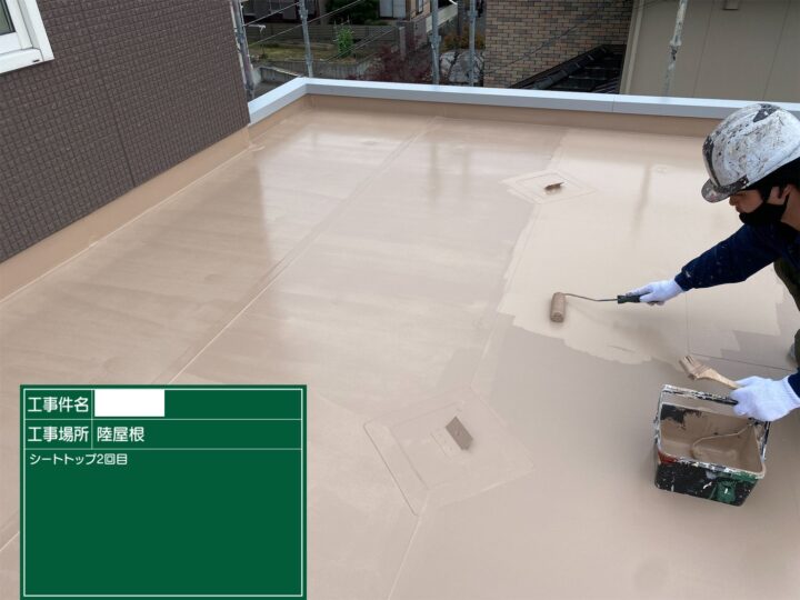 遮熱のトップコートを塗装し、防水シートの劣化を防ぐようにしました。
