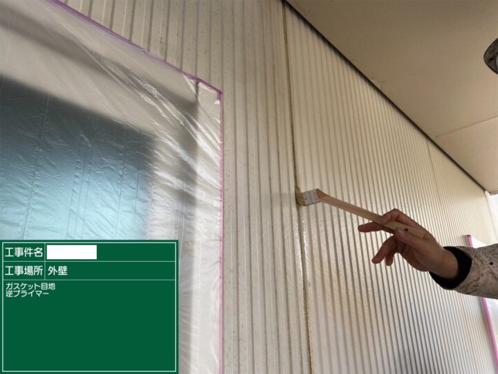 下地処理で劣化などを補正したり、ガスケット目地のプライマー塗布を行ったりしました。