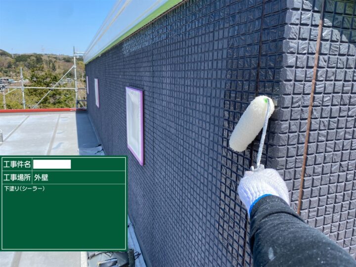 下処理後、あとの中塗り、上塗りの密着性や耐候性を担保するために、シーラーで下塗りを行いました。