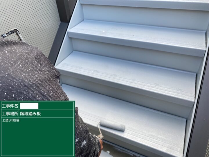 鉄骨階段も紙やすりで汚れを落とした後、下塗りとして錆止めを塗布しました。