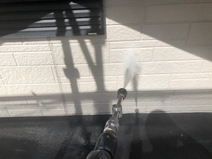 はじめに高圧洗浄を行いました。壁に付着した汚れをしっかり洗い流すことで、塗装後の美観にもつながり、塗膜が上手に密着します。