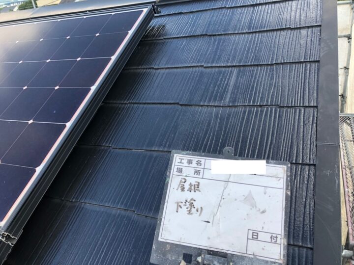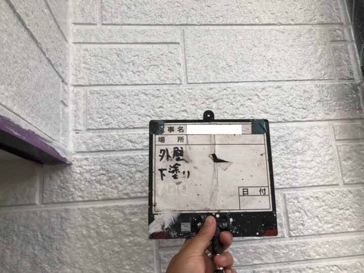 下地処理を行ったあと、中塗り、上塗りの密着度を高めるため、下塗りを行いました。下塗りを行えば長期の耐久年数が確保される中塗り、上塗りの下地にもなります。