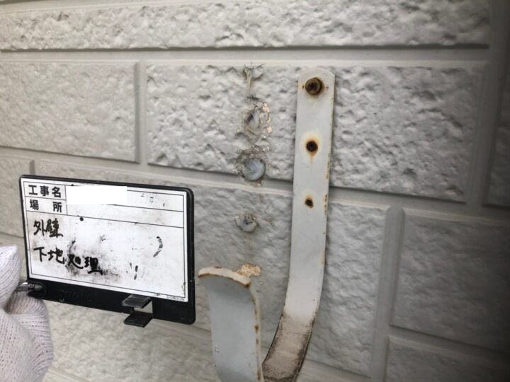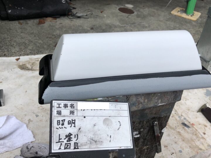 下地処理では高圧洗浄では落とせなかった汚れの除去や鉄部の足付けを、紙やすりなどでしっかり行いました。表面に傷をつけることで次に塗る塗膜がうまく浸透します。