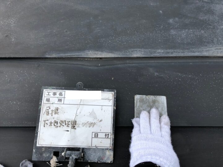 下地処理が終わったあと、下塗りとして鉄部には錆止めを入れ、屋根材にはシーラーを塗布しました。ケレンで表面に傷を作ったため、うまく浸透し、塗りムラなく塗装を行うことができました。