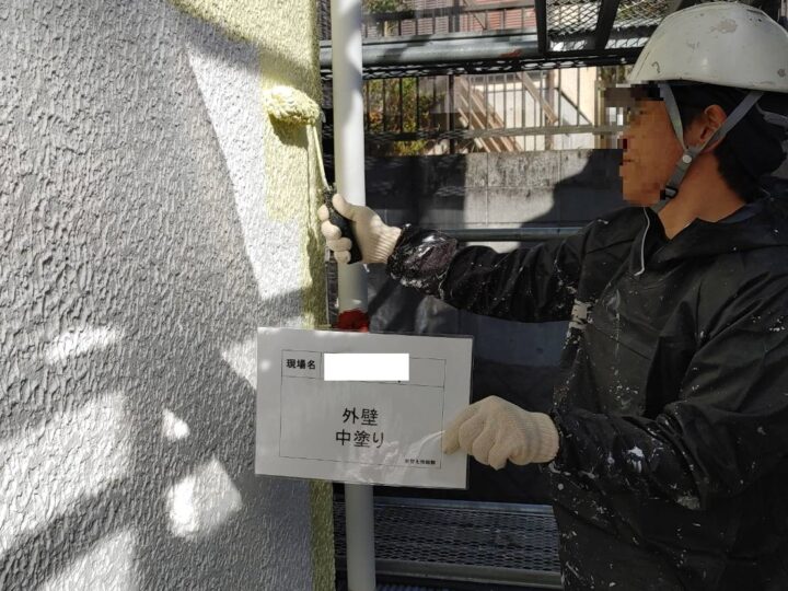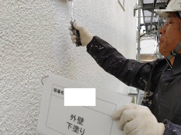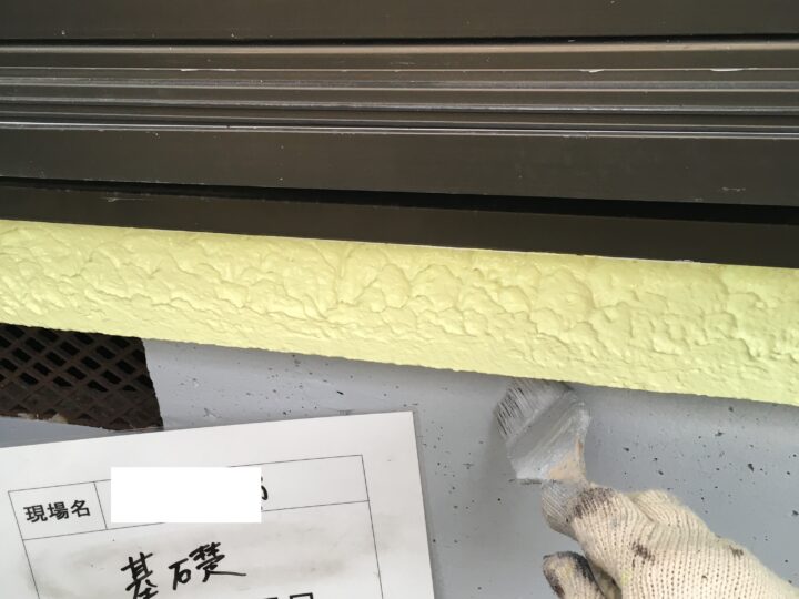 下塗りでは微弾性のサーフェーサーを使用し塗装しました。下地処理での凸凹を下塗りで平坦にし、その後の中塗りと上塗り塗料が密着しやすい壁を作りました。
