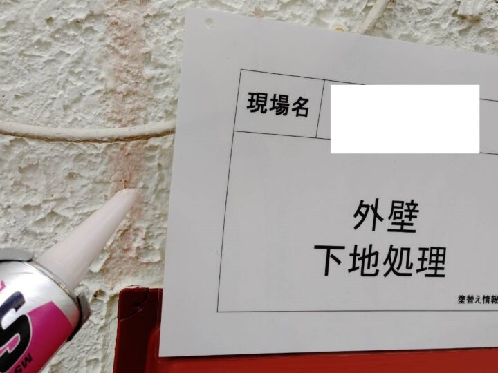 下地処理では、地震などが原因で発生するクラックをシーリングで補修したり、根強い汚れは紙やすりなどのケレンで落としていきました。