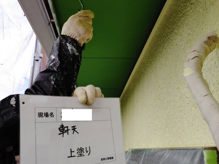 ケイ酸カルシウム板の軒天井は、屋根の下地材を隠すための部位で、影になっている場所が多いため、湿気が多くカビが生えやすい部位でもあります。洗浄で落としきれなかった汚れ等を落とすために、ケレンなどで下地処理を徹底的におこなったあと、NAD系塗料2回塗りで仕上げました。