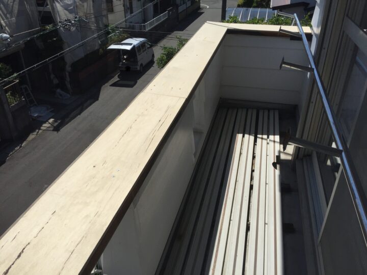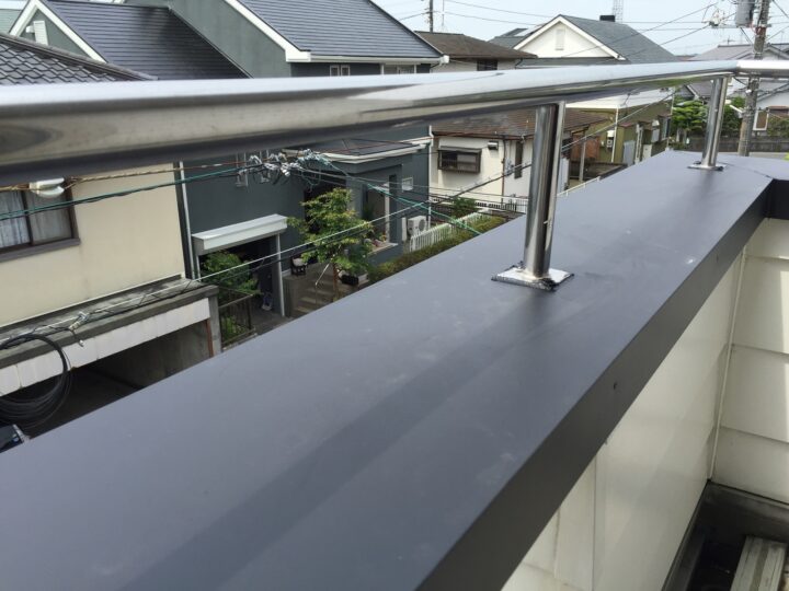 防水シート貼り後、新規笠木取り付け、手摺り取り付け