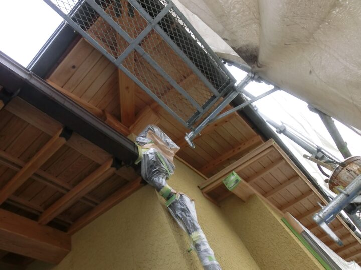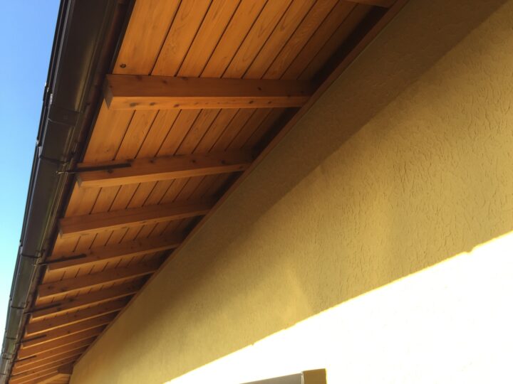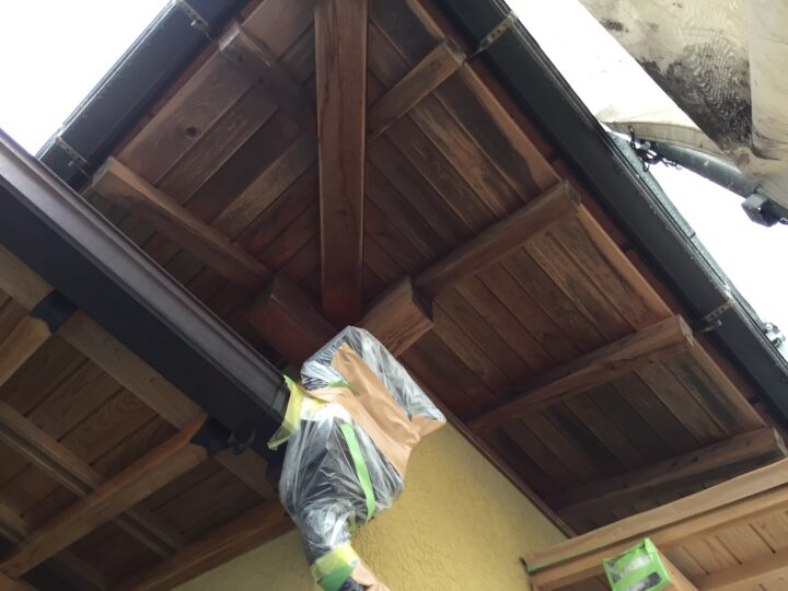 ジョリパットの外壁を風合いを残したままキレイにアートフレッシュで塗り替えました。また、木部(軒天井や垂木、玄関の柱)などは汚れ染みが多かったですが塗りつぶすのではなく、薬品で洗い新品の木のように甦らせました。