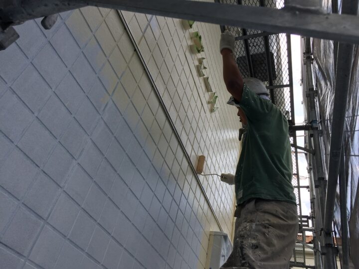 下塗り:日本ペイントファイン浸透シーラー(ホワイト)、中塗り上塗り:日本ペイントファインパーフェクトベスト