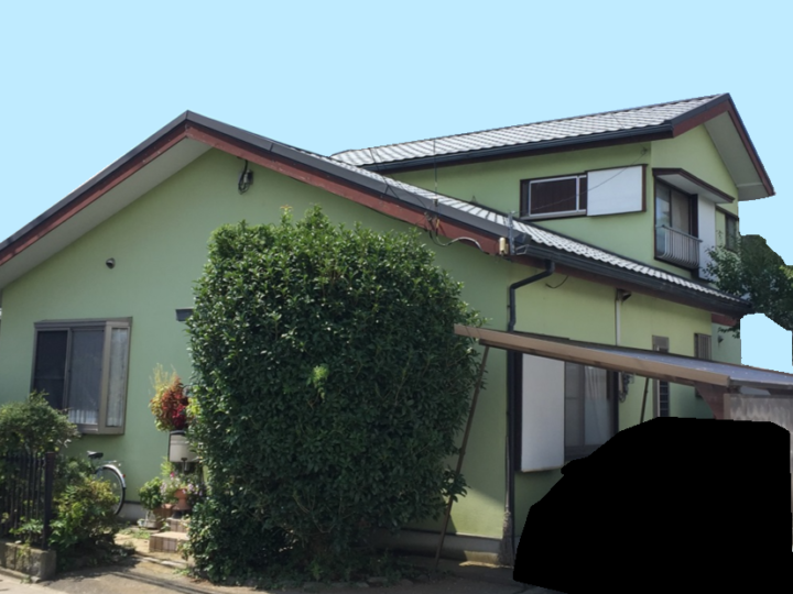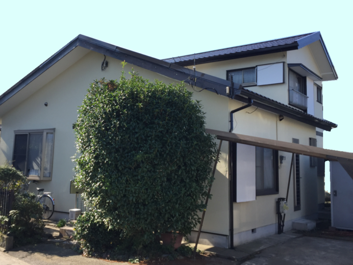 過去に増築や窓の交換などを行っている沼津市のM様邸、増築部や窓交換部分にはヒビが多く発生していましたがしっかりとVカット処理をし塩ビシート鋼板屋根もブリードなども無く新築のような仕上がりになりました。