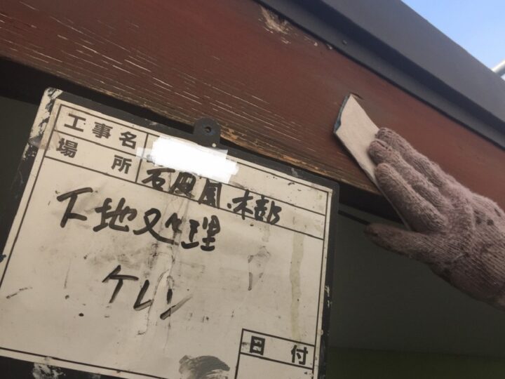 木部はペーパー掛けをし、既存塗膜のメクレや剥がれをしっかりと取り除きます。