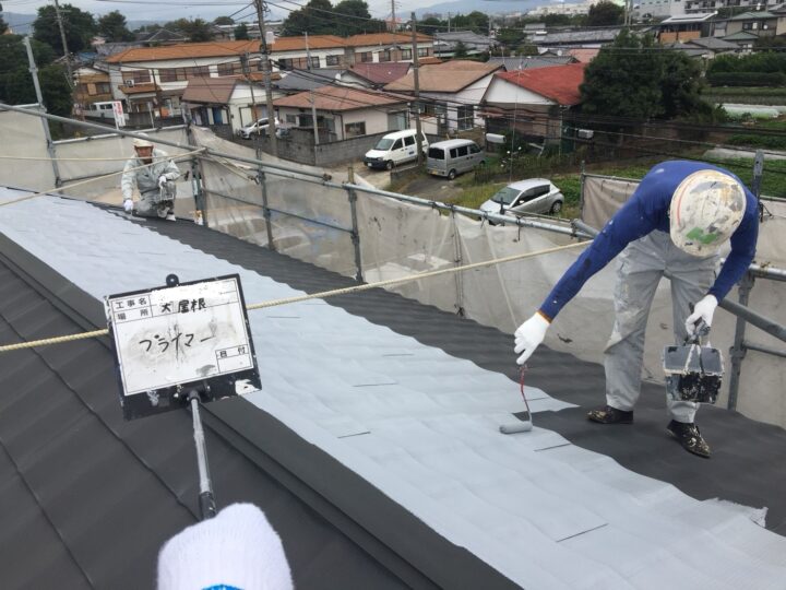 塩ビシート鋼板の屋根は劣化し少し錆が出ていましたので下塗りにニッペハイポンファインプライマー?を使用しています。
