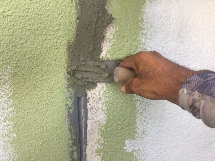 外壁の増築部分などに多く出ていたひび割れヵ所のVカット補修。