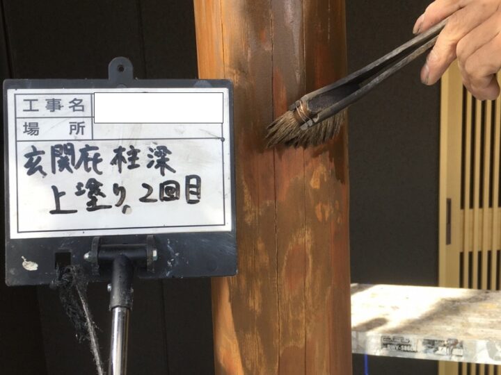 玄関の柱と梁は防腐剤で仕上げ、軒天井は艶消しの塗りつぶしで仕上げました。