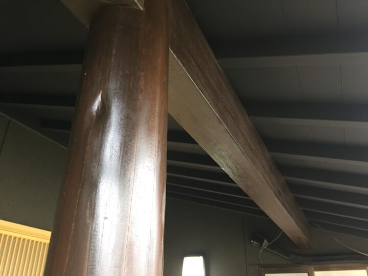 玄関の柱と梁は、ニスを剥がし、薬品洗浄をし防腐剤で仕上げました。