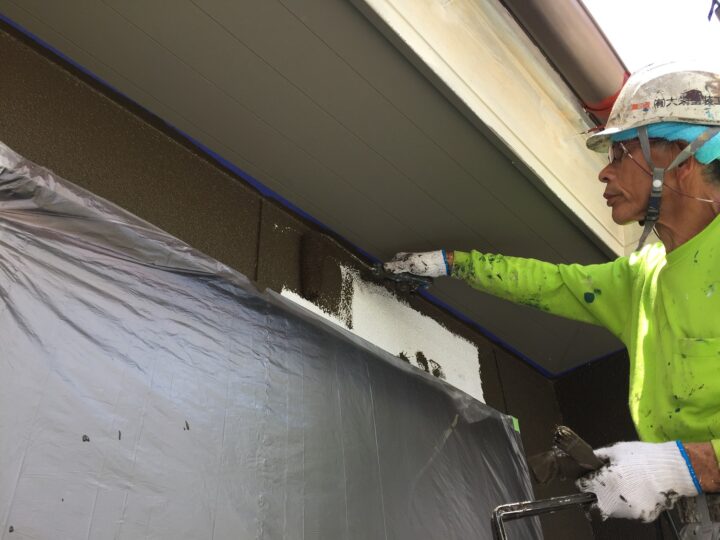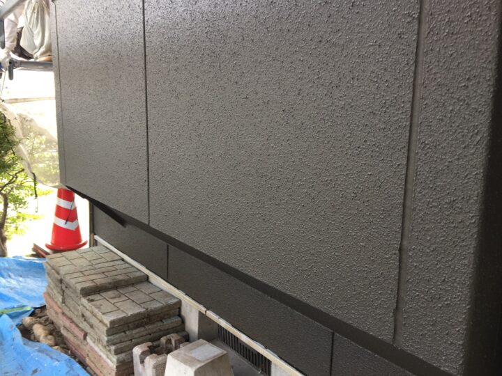さんとうばん外壁の塗り替え工事を行いました。盤間目地やサッシ廻りは高耐久のオートンイクシードで打ち替え、仕上げはシリコン塗料の3分艶有りで仕上げ、リシンの雰囲気を残しつつ高耐久な外壁に生まれ変わりました。