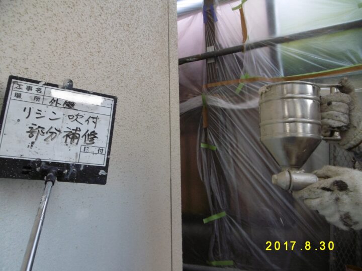 前回のリフォーム工事の際にそのまま色だけ塗られた外壁や今回新しく張り替えた外壁部分を周りのパターンに合わせ補修吹きを行いました。