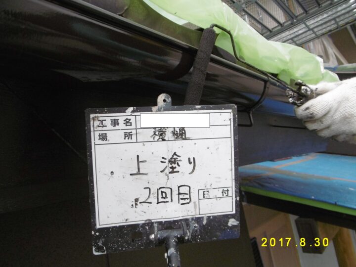 雨樋などはしっかりとペーパーを当て上塗り2回塗りで仕上げます。