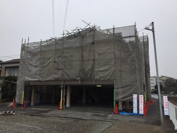 屋根の傾斜(勾配)が急なため、屋根上部にも作業用の足場を設置しました。また、作業者や周囲の安全も確保し作業のしやすい安全な足場を設置します。