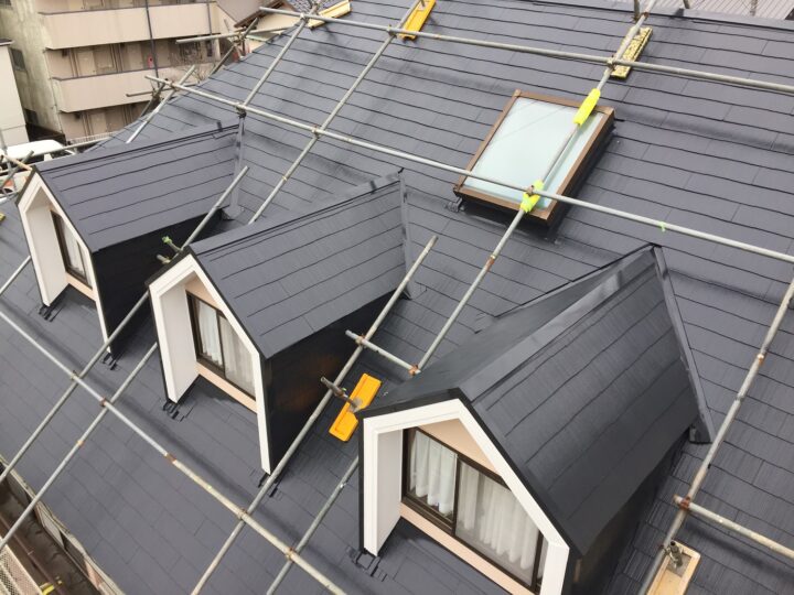 コロニアル屋根はKFケミカルの遮熱フッ素塗料を使用し、高耐久な屋根になりました。また勾配が大きいためタスペーサーは使用しません。