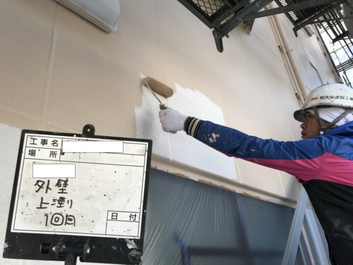 ALCの外壁には、遮熱弾性シリコン塗料を使用し、下塗り・中塗り・上塗りの3回塗りで仕上げました。
