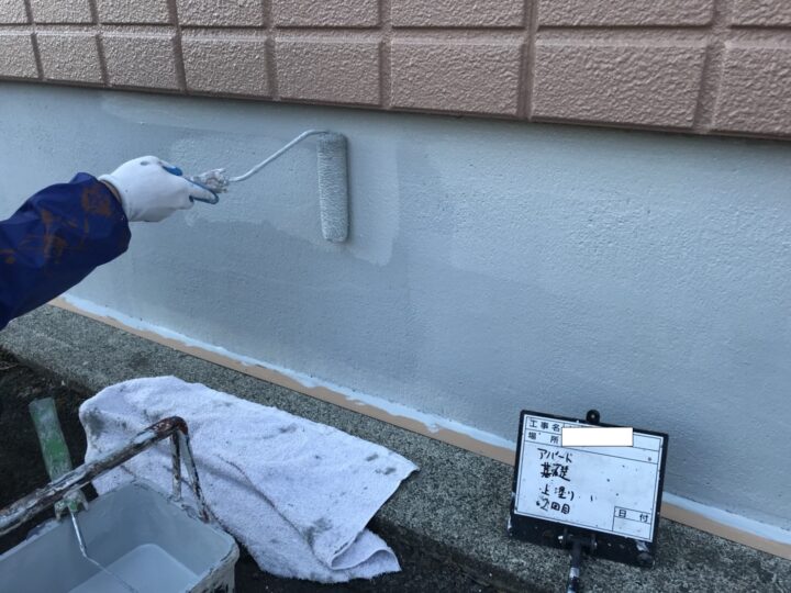 土台コンクリートの基礎はプライマーを塗り、上塗り2回塗りの艶消し仕上げで仕上げました。