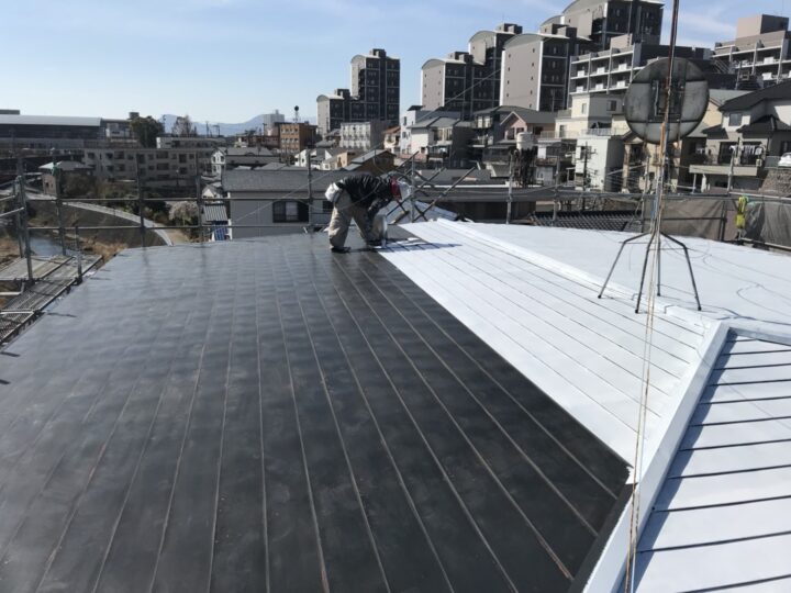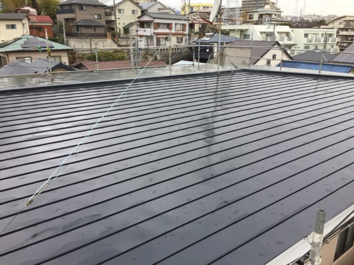 ガルバリウム鋼板屋根は遮熱フッ素塗料を使用し、錆止めプライマー・中塗り・上塗りの3回塗りで仕上げました。