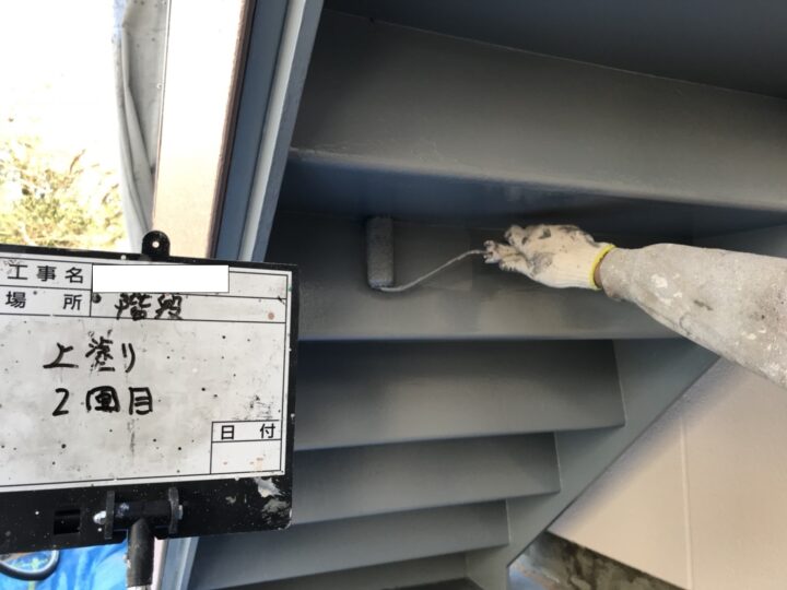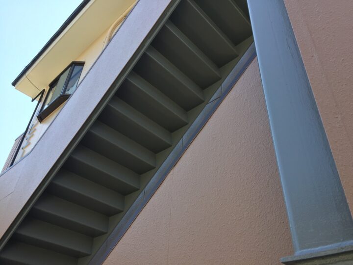 鉄骨階段などの鉄部は錆をしっかりと落とし、錆止め・上塗り2回で仕上げます。