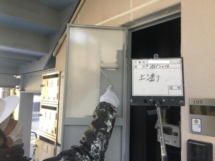 集合住宅には良くあるパイプシャフトのドアや枠も内側までしっかりと塗装します。