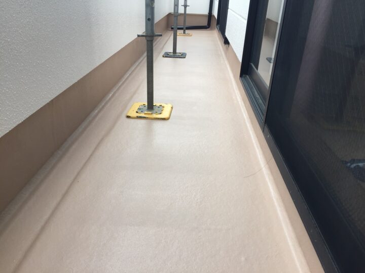 バルコニー床のFRP防水は、専用プライマーと専用塗料でノンスリップ仕上げで仕上げました。