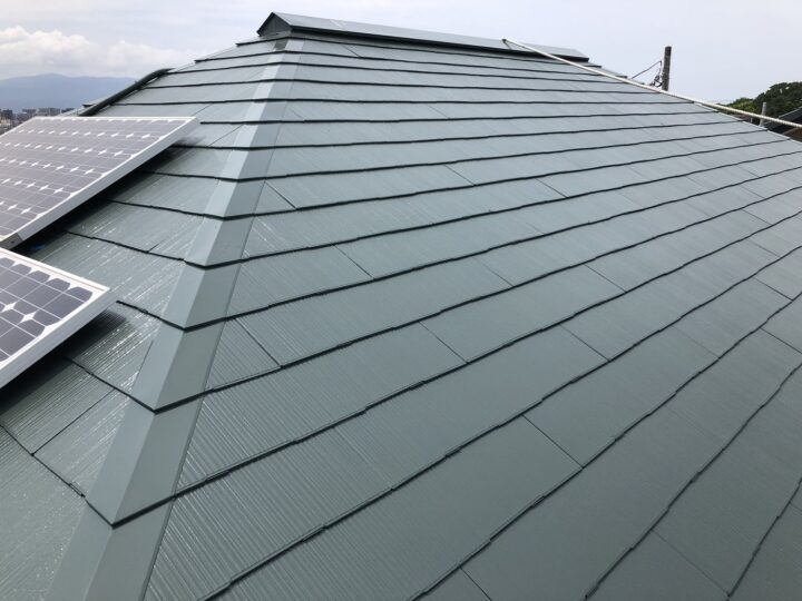 屋根はKFケミカルの無機フッ素塗料(KFセミフロンスーパールーフ)で塗装し、深い緑のモスグリーンに仕上げました。