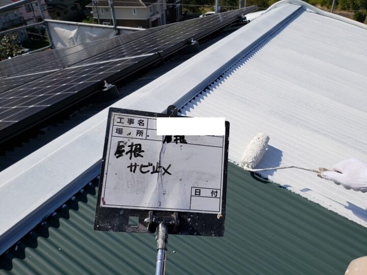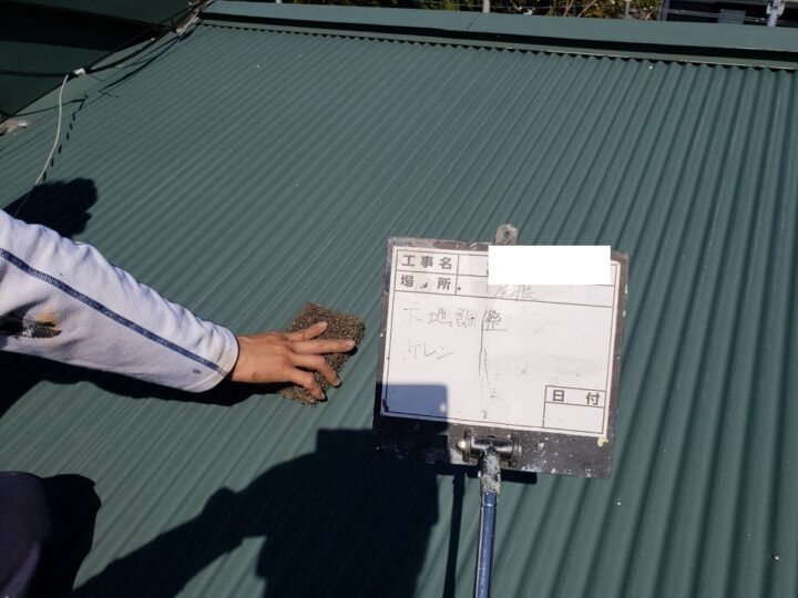 屋根もしっかりと下地調整を行います。ケレンにて足付けをし塗料の密着度を高めます。