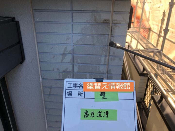 塗装前には、チョーキングによる粉化を落とすために念入りな高圧洗浄を行います。