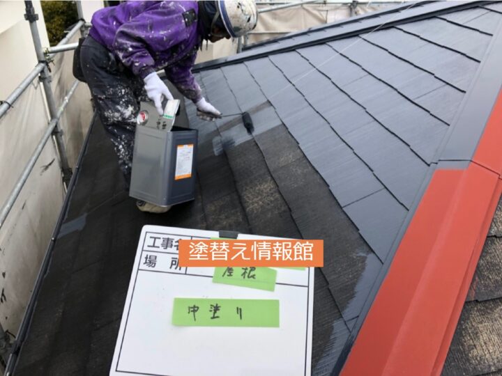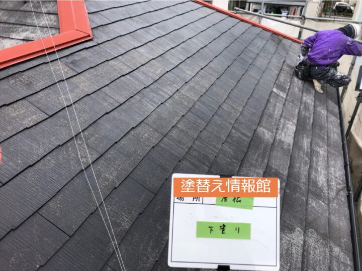 屋根はカラーベストの状態を見ながら、十分にシーラーを塗布して上塗り剤の吸い込みを押さえます。