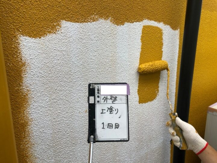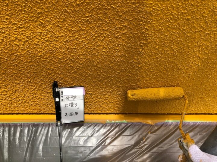 外壁の中塗りにはSK化研のプレミアムシリコンを使用。中塗り・上塗り共に同じ塗料を2回塗ります。