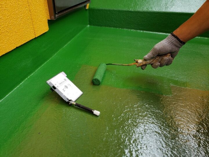 FRP防水の床は下地処理(ケレン)し、プライマーを塗りFRP専用トップコートで保護していきます。