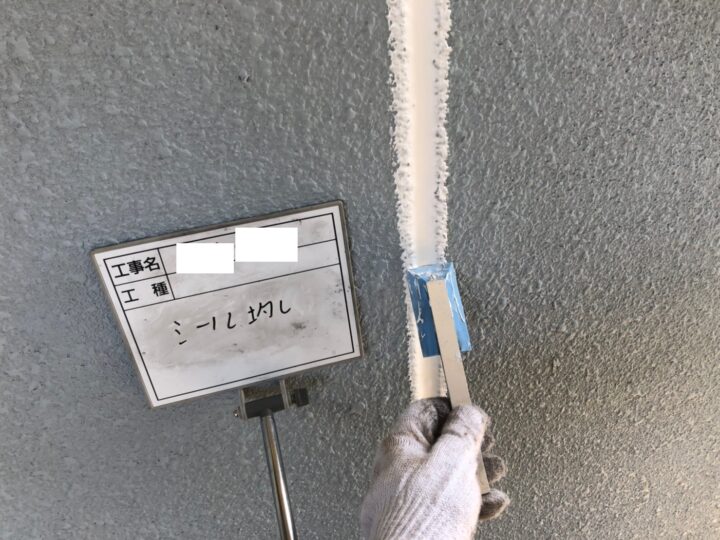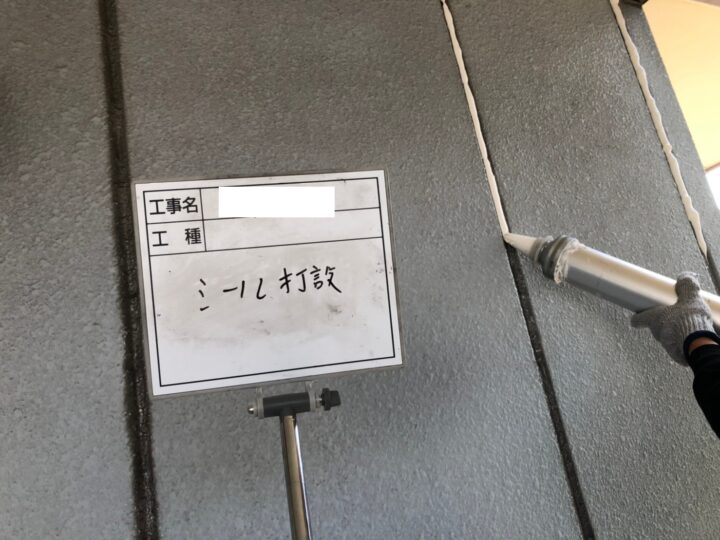 プライマーを塗布した全ての目地に、上から増し打ちの形式でシーリング材を打設しました。窓サッシの水切り上端のように、打替えが可能な場所のシーリングは打ち替えを行いました。
