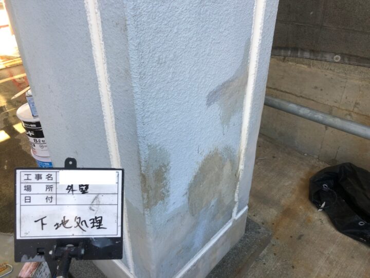 シーリング工事が終了後、外壁の下地処理を行いました。軽微なクラックはシーリング処理を施し、大きな剥落はモルタル充填、カチオン塗布、シーラー塗布の順で処理を行いました。